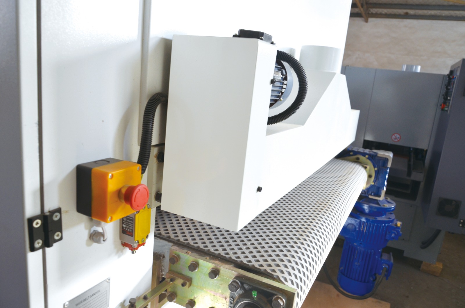 Les rouleaux en acier de grand diamètre garantissent une planéité irréprochable sur toute la surface. Le convoyeur à tapis avec variateur de fréquence permet d'ajuster finement la vitesse d'avance jusqu'à 20 m/min en fonction du type de ponçage requis.